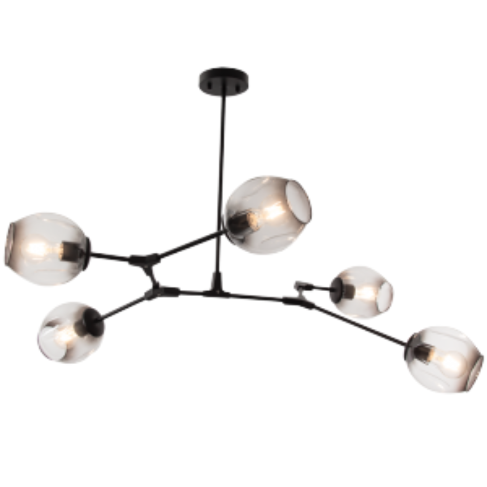 Add a touch of modern sophistication to your space with this stylish chandelier, crafted from metal and smoke glass. The moody tones of the glass shades create a refined ambiance, while the adjustable height offers versatility for various ceiling settings. Designed to hold five LED bulbs, it delivers both function and visual impact.