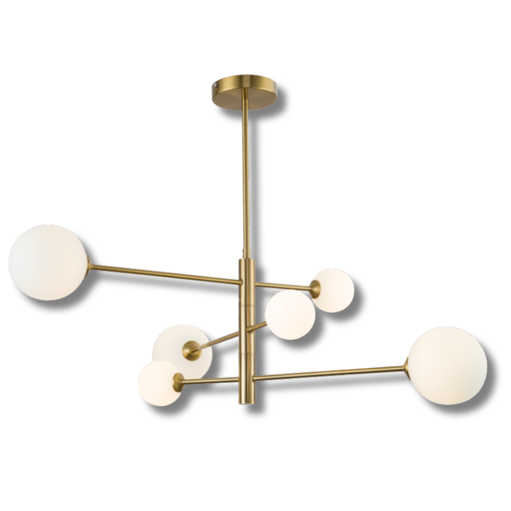 This elegant chandelier pairs a refined metal frame with smooth opal glass shades to deliver soft, ambient lighting with a contemporary twist. Designed to accommodate six G9 LED bulbs, it offers functional brightness while serving as a stylish focal point in living rooms, dining spaces, or entryways.