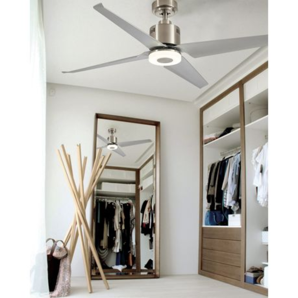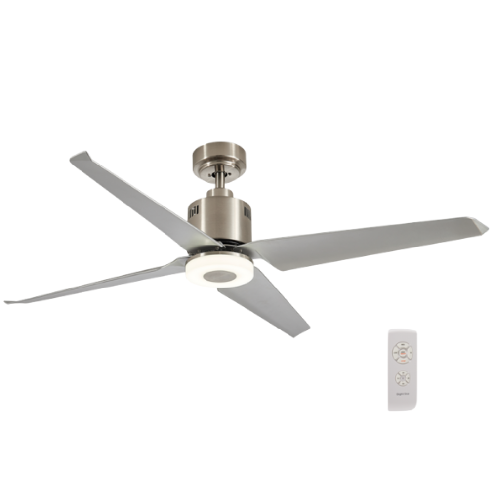 Enhance your living space with this sleek ceiling fan, featuring a modern satin nickel finish and four durable silver ABS blades spanning 52” (132 cm). Powered by an energy-efficient 40W copper coil DC motor, it delivers powerful yet quiet airflow. The included remote control offers six-speed settings, light adjustment, and a convenient timer function for personalised comfort. An integrated 15W LED light provides versatile illumination with adjustable colour temperatures from 3000K to 6000K. A balancing kit is included to ensure smooth, stable operation—perfect for contemporary interiors seeking both style and performance.