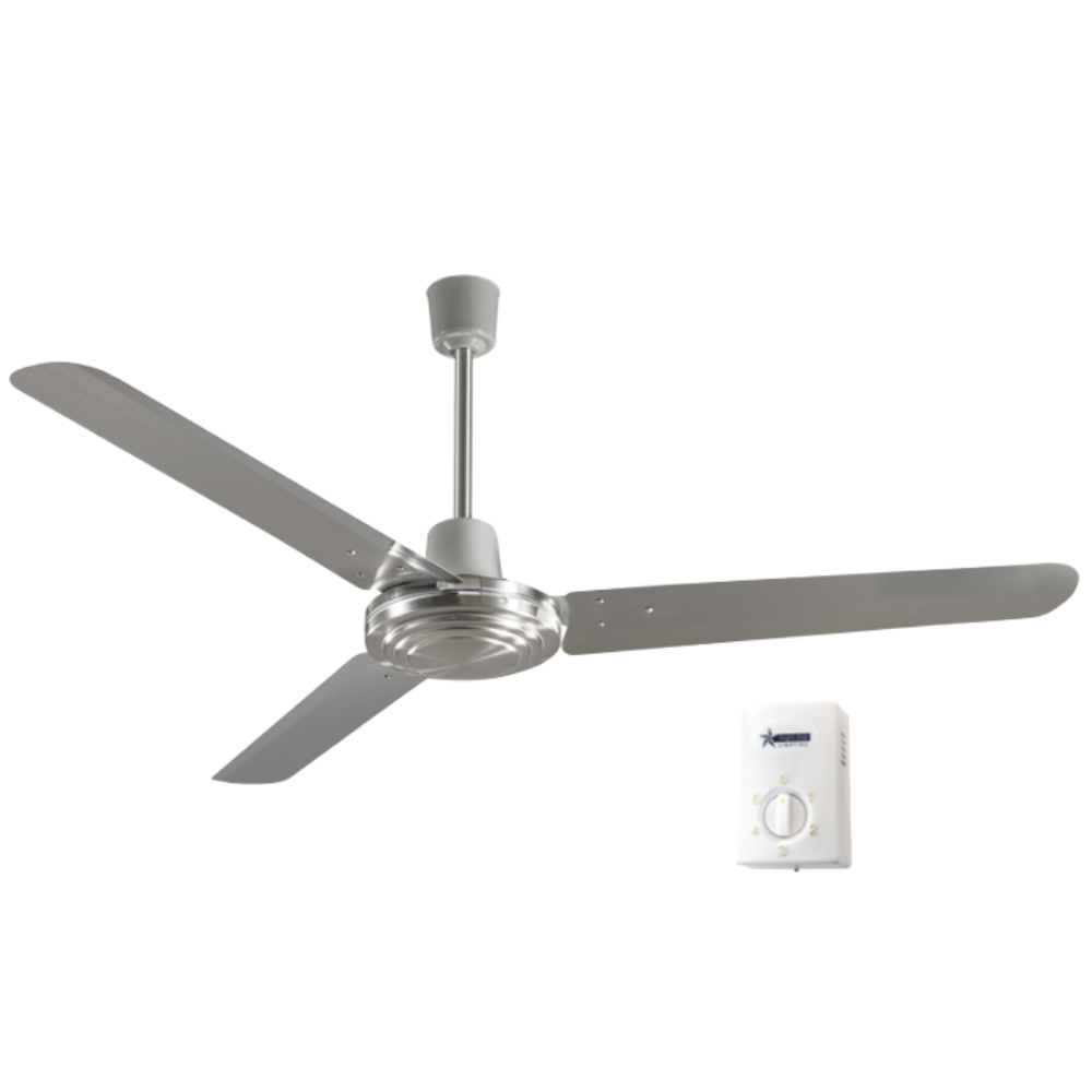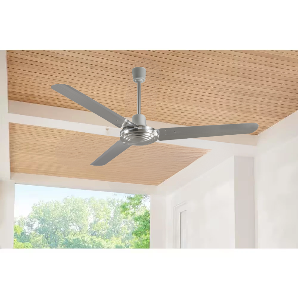 This industrial-grade stainless steel fan features three metal blades measuring 56” (142 cm) in diameter, powered by an 80W AC motor with a copper coil for enhanced durability and performance. The stainless steel construction ensures long-lasting reliability in demanding environments.