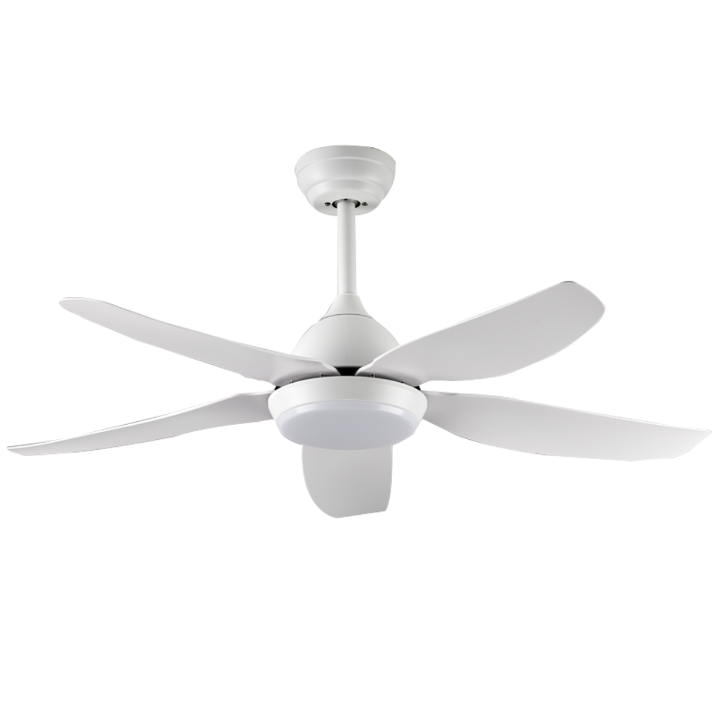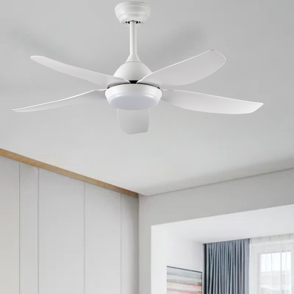This ceiling fan features a white metal frame with five white ABS blades powered by a 35W copper coil DC motor. Measuring 44” (112 cm), it includes a remote control offering six-speed settings and a timer function. The package comes with a balancing kit and an 18W LED light with adjustable colour temperatures of 3000K, 4000K, and 6000K for versatile lighting options.