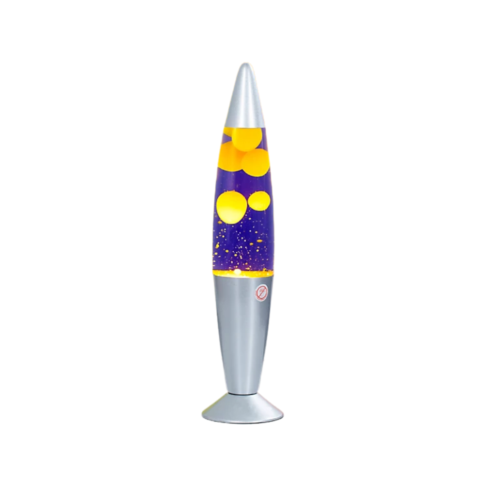 This Brightstar TL108 Lava Lamp features a silver base and uses a single 20W SES bulb, delivering a striking yellow and purple lava effect that enhances any space with a classic yet refined touch.