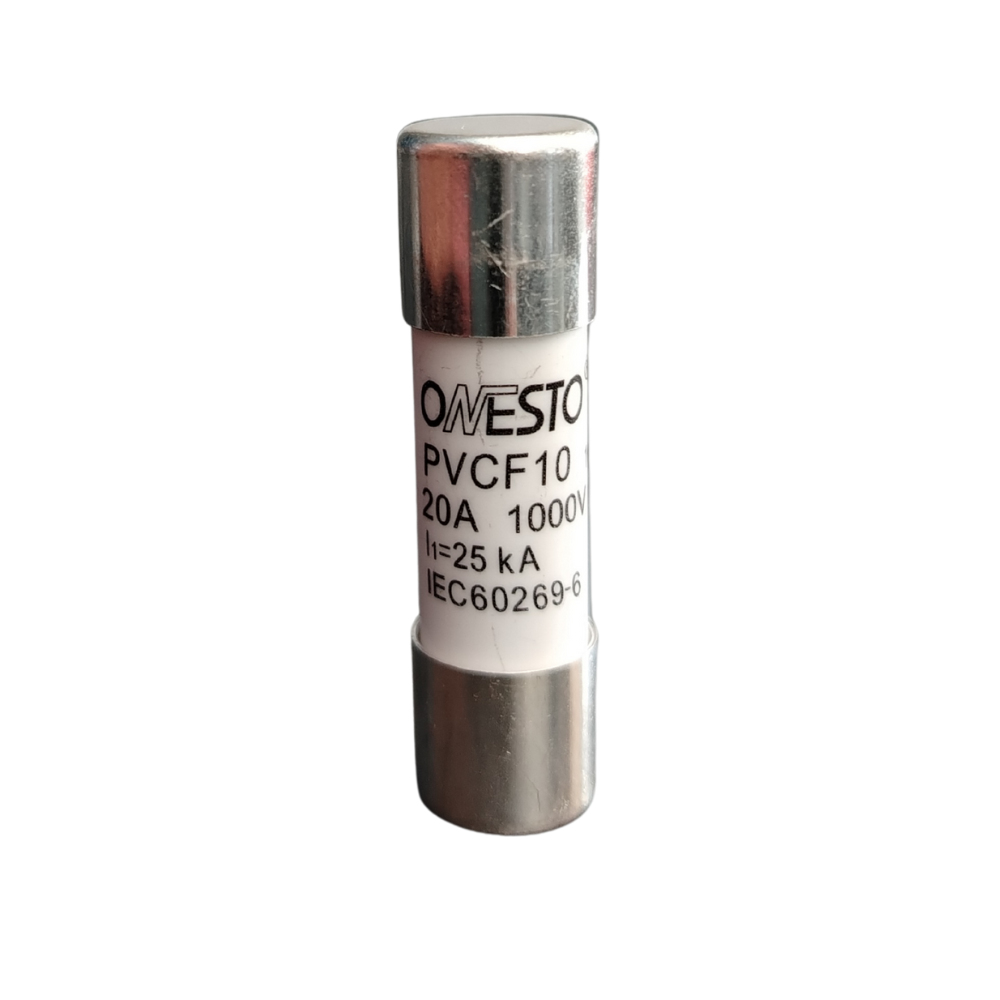 The Onesto 20A 1000VDC Solar Fuse is a cylindrical PV fuse designed to protect direct current circuits in solar installations. Its compact 10 × 38 mm form factor ensures compatibility with standard solar fuse holders and combiner boxes, providing reliable and fast-acting overcurrent protection for photovoltaic strings and inverters.